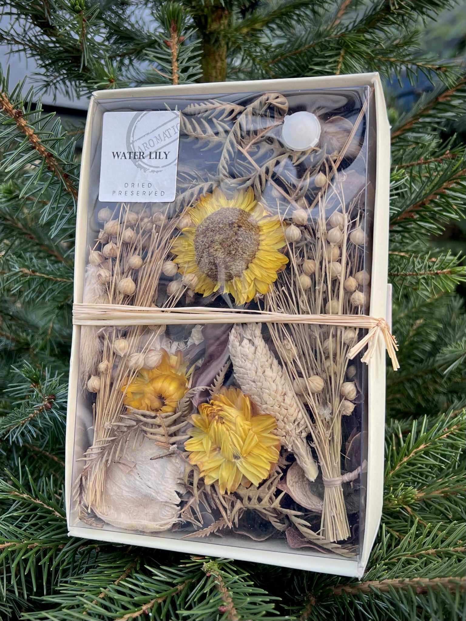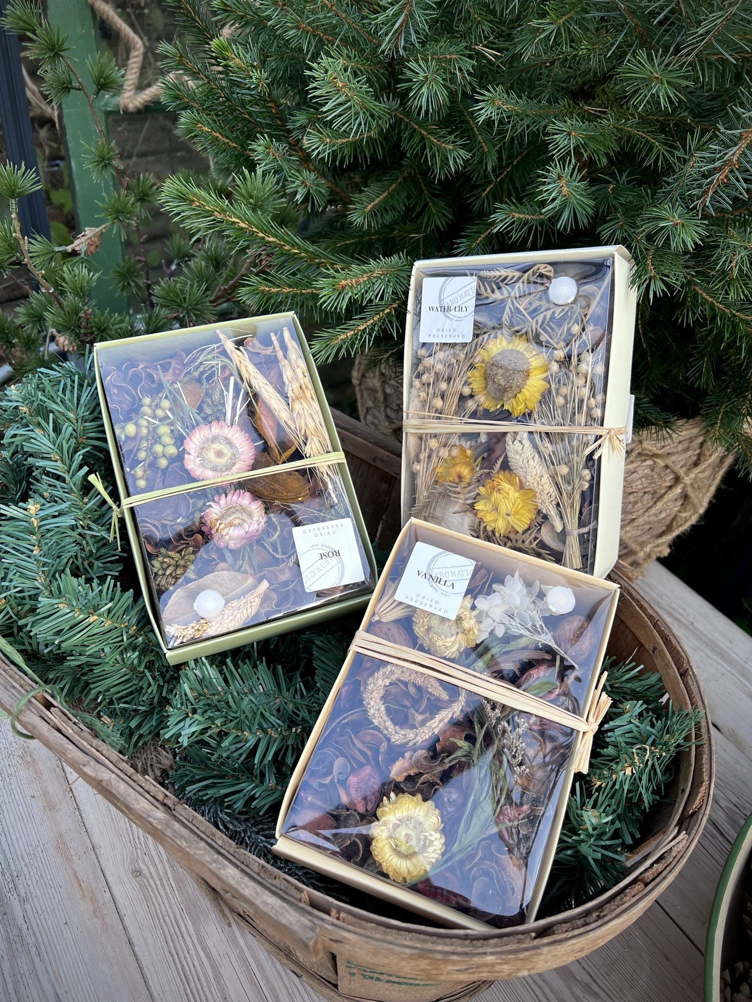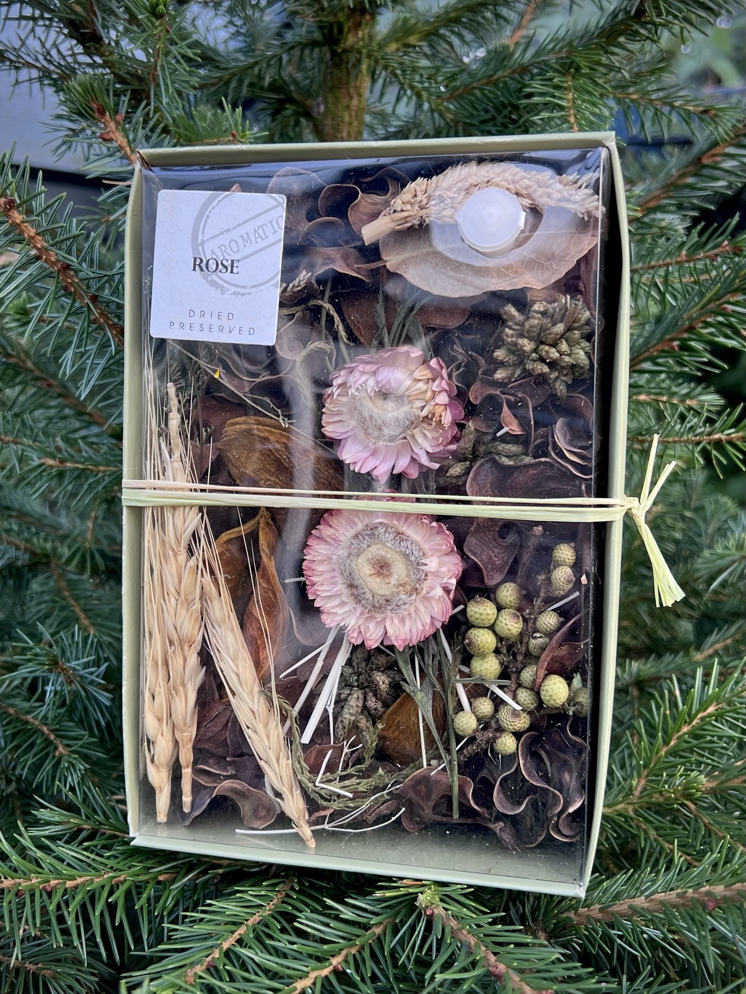 Potpourri i skønne dufte til dekorationer til efterår og jul. Æskerne fås i forskellige farver med dertilhørende forskellige naturnuancer – vælg mellem hvid, gul, blå og grøn.